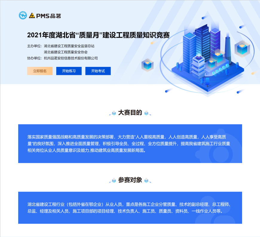 为积极响应市场监管总局等20个部门关于开展2021年全国“质量月”活动的通知精神,省质安总站联合省质安协会举办了2021年度湖北省“质量月”建设工程质量网络知识竞赛。竞赛旨在大力营造“人人重视高质量,人人创造高质量,人人享受高质量”的良好氛围,深入推进全面质量管理,积极引导全员、全过程、全方位质量提升,提高我省建筑施工行业质量相关岗位从业人员质量意识及能力,推动建筑业高质量发展新局面。