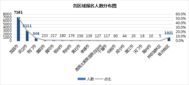 本次竞赛报名共计13641人,其中宜昌市7161人,武汉市3111人,荆门市846人,襄阳市233人,黄冈市217人,鄂州市180人,荆州市176人,黄石市156人,孝感市139人,恩施土家族苗族自治州127人,十堰市117人,仙桃市60人,咸宁市44人,潜江市20人,天门市18人,随州市10人,神农架林区5人,省外地区1021人。详见图1。