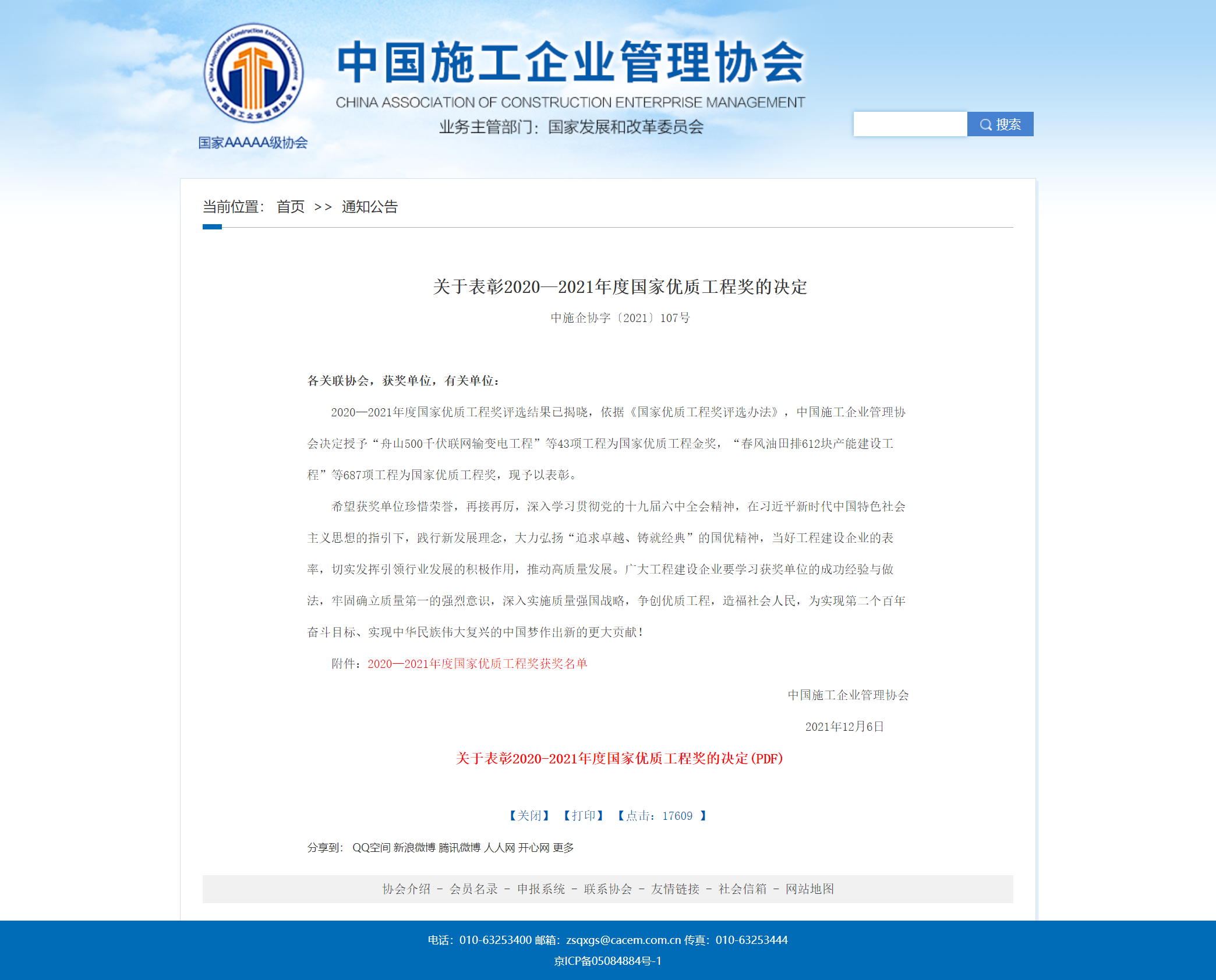 12月6日,中国施工企业管理协会发布了2020—2021年度国家优质工程奖名单,43项工程获得国家优质工程金奖,687项工程获得国家优质工程奖。省质安协会推荐的16项工程入选,获奖数量创历史新高。
