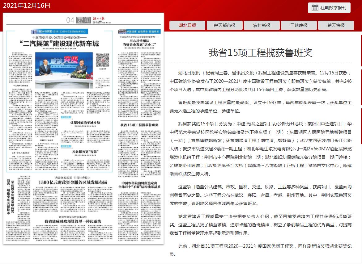 湖北日报讯我省工程建设质量喜获新荣誉。12月15日获悉,中国建筑业协会发布了2020—2021年度中国建设工程鲁班奖(即鲁班奖)获奖名单,共有246个项目入选,其中我省境内工程分两批次共计15个项目上榜,获奖数量创历史新高。