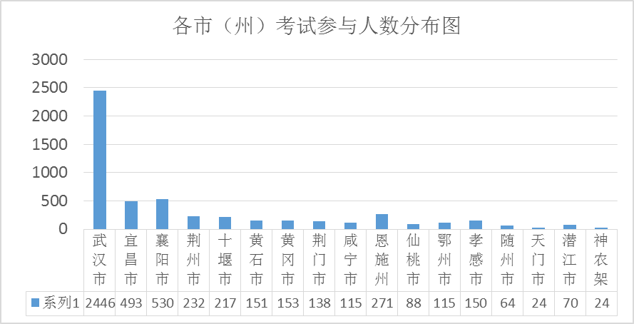本次竞赛报名人数达5529人,实际参加竞赛人数:5281人,网上登记检测人员9596人,占比55.03%。参加竞赛人数中,武汉市2446人,宜昌市493人,襄阳市530人,荆州市232人,十堰市217人,黄石市 151 人,黄冈市153人,荆门市138 人,咸宁市115 人,恩施州271人,仙桃市 88 人,鄂州市115人,孝感市150 人,随州市 64 人,天门市 24 人,潜江市 70 人,神农架林区 22 人。