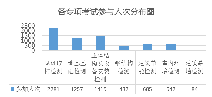 各专项竞赛人次分别为:见证取样检测专项 2281 人,地基基础工程检测专项 1257 人, 主体结构及设备安装工程检测专项 1415 人,钢结构工程检测专项 432 人,建筑节能检测专项 605 人,室内环境检测专项 642 人,建筑幕墙检测专项 84 人,累计考试人次为:6716 人次。
