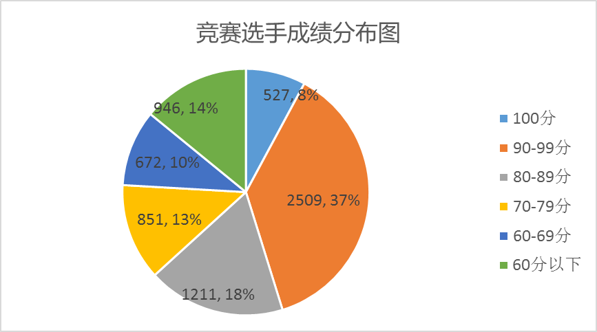 本次竞赛中,100分的人数达527人次,占比7.84%,90-99分人数达 2509 人次,占比 37.36%; 80-89 分的人数 1211 人次,占比 18.03%;70-79 分的人数 851 人次,占比 12.67%;60-69 分的人数 672 人次,占比 10.01%;60分以下人数 946 人次,占比 14.09%。