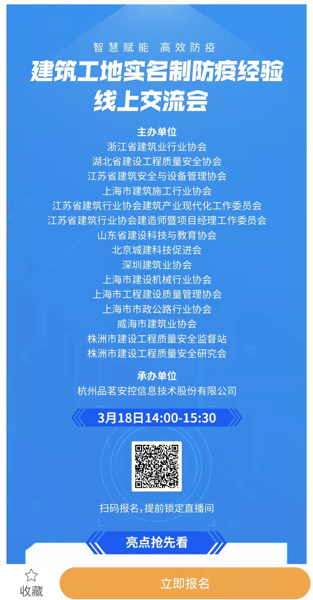 近期,国内疫情呈现多点散发、局部暴发态势。为切实做好常态化疫情防控工作,规范工地人员健康管理、进出管理,高效准确掌握人员健康和流动情况,进一步保障工程建设项目顺利、安全地运行,3月18日,由湖北省建设工程质量安全协会、浙江省建筑业行业协会、株洲市建设工程质量安全监督站等15家主管部门和协会联合主办,杭州品茗安控信息技术股份有限公司承办的“智慧赋能,高效防疫——建筑工地实名制防疫经验线上交流会”成功举办,来自全国各地相关行业人员通过线上直播和线下视频会议参加培训,累计在线人次达3万人次在线观看。