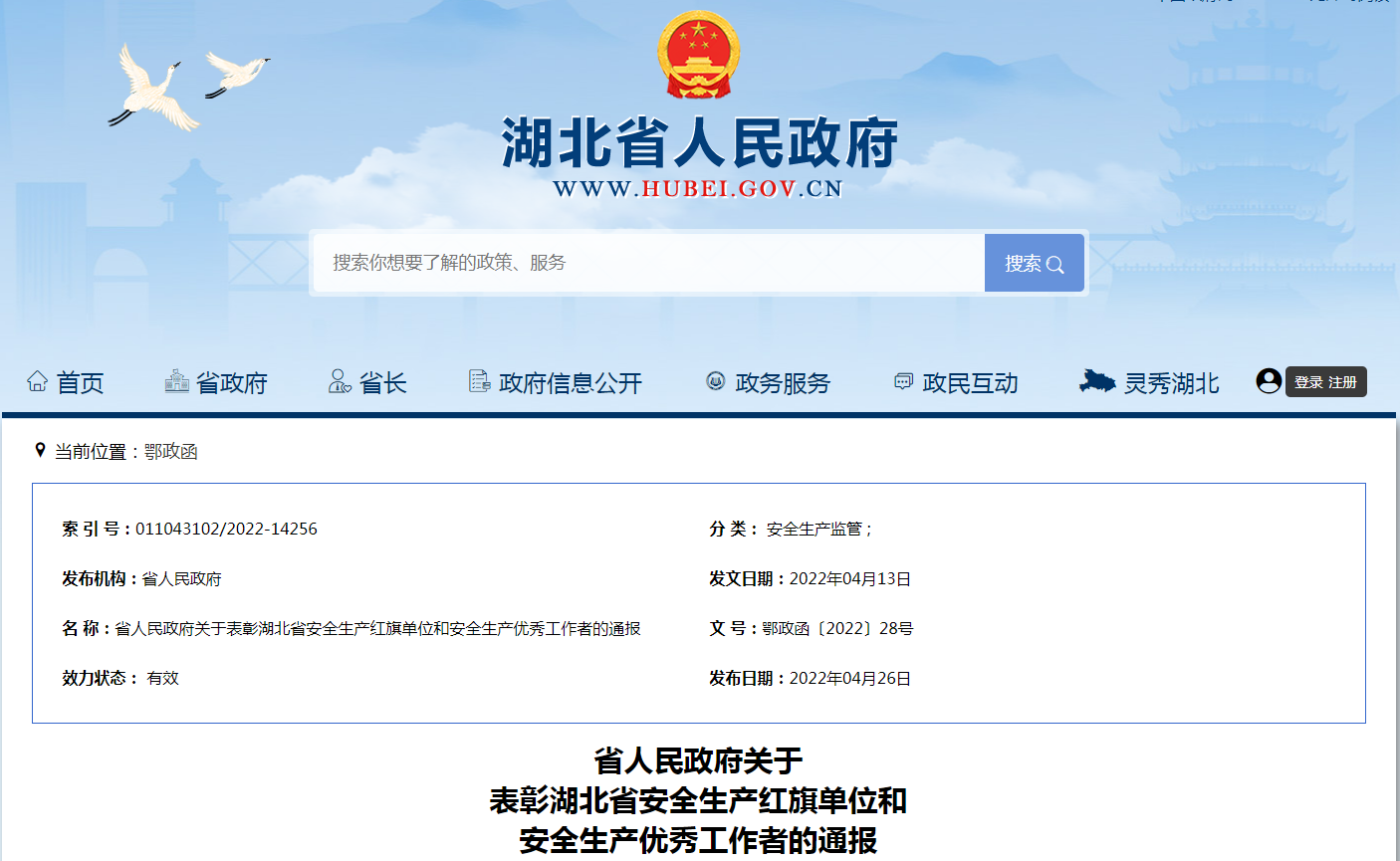 近日,省政府印发《关于表彰湖北省安全生产红旗单位和安全生产优秀工作者的通报》,近年来,全省坚持以习近平新时代中国特色社会主义思想为指导,深入学习贯彻习近平总书记关于安全生产重要论述,认真落实党中央、国务院决策部署和省委、省政府工作要求,在工作中,涌现出一批严格遵守安全生产法律法规,认真履行安全生产工作职责,积极推动安全生产工作的红旗单位和优秀工作者,为维护人民群众生命财产安全和社会稳定,促进全省经济社会高质量发展作出了积极贡献。经省委、省政府同意,授予省建设工程质量安全监督总站等50个单位“湖北省安全生产红旗单位”称号。