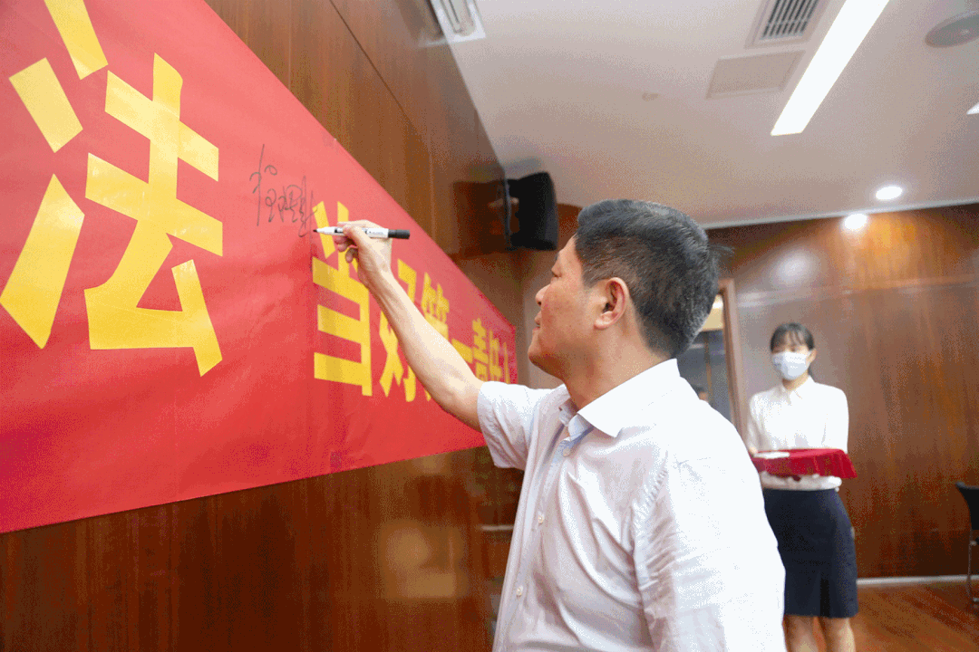 安全生产月,人人是主角。活动最后的安全承诺签名仪式上,与会人员依次在印有“遵守安全生产法 当好第一责任人”主题的红色条幅上郑重地签下自己的名字,把承诺记在心上、落到实处,切实履行岗位职责,为安全生产和企业发展贡献应有的力量。