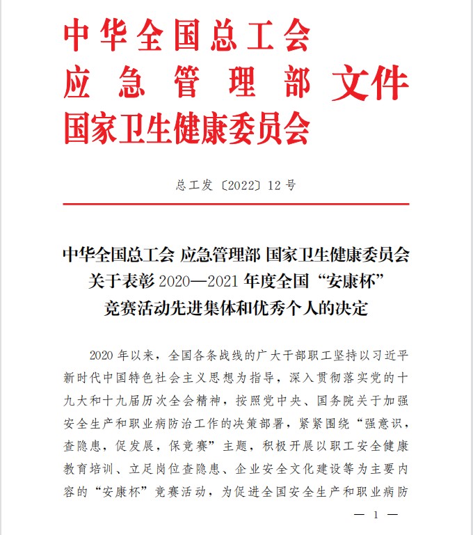 近日,中华全国总工会、应急管理部、国家卫生健康委员会联合发文,表彰2020—2021年度全国“安康杯”竞赛活动先进集体和优秀个人,由我会推荐的中建三局集团有限公司工程总承包公司中南财经政法大学项目经理邓雄兵获得 “安康杯” 竞赛“优秀个人”荣誉。