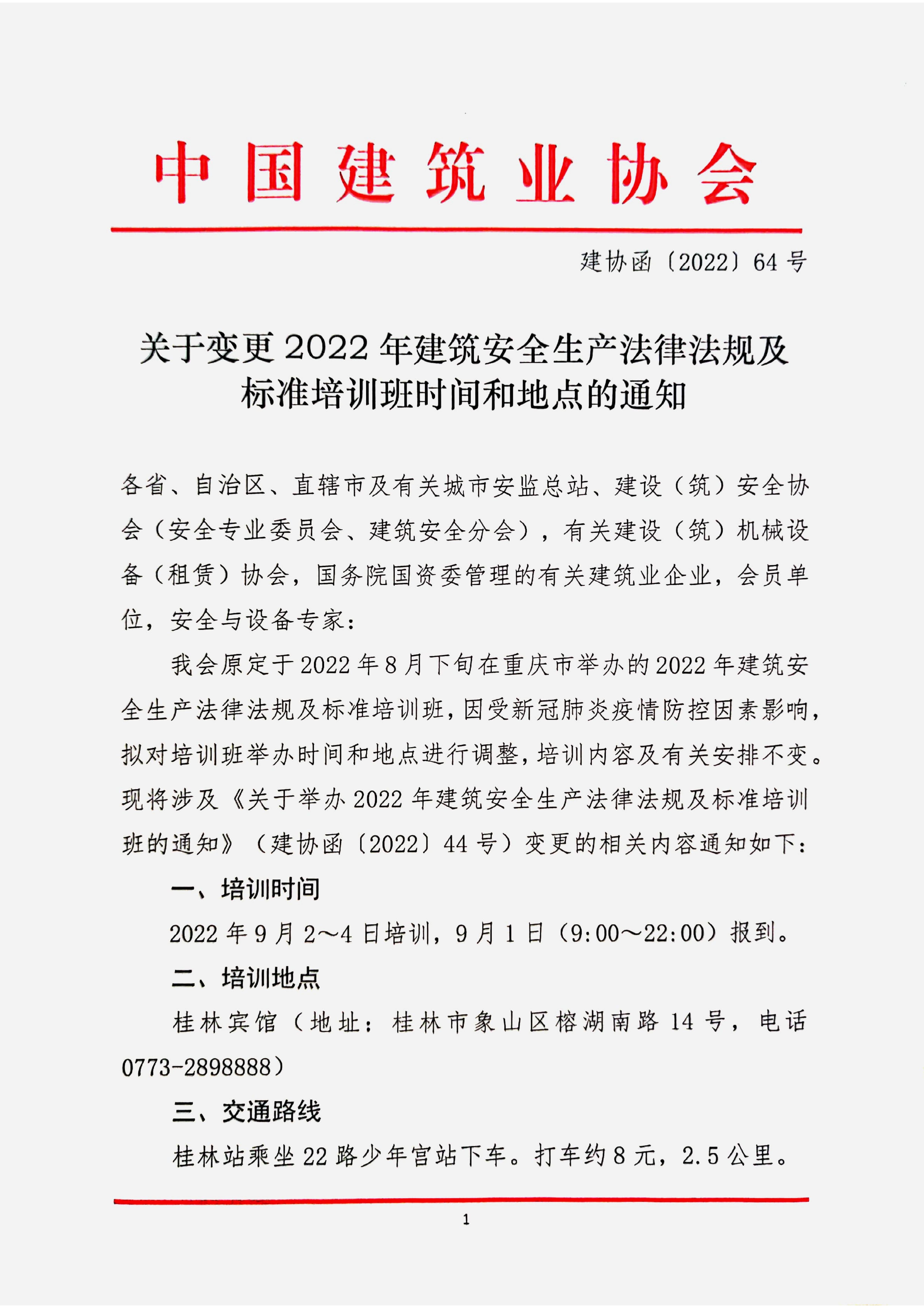 附件:《关于变更2022年建筑安全生产法律法规及标准培训班时间和地点的通知》(建协函〔2022〕64号)