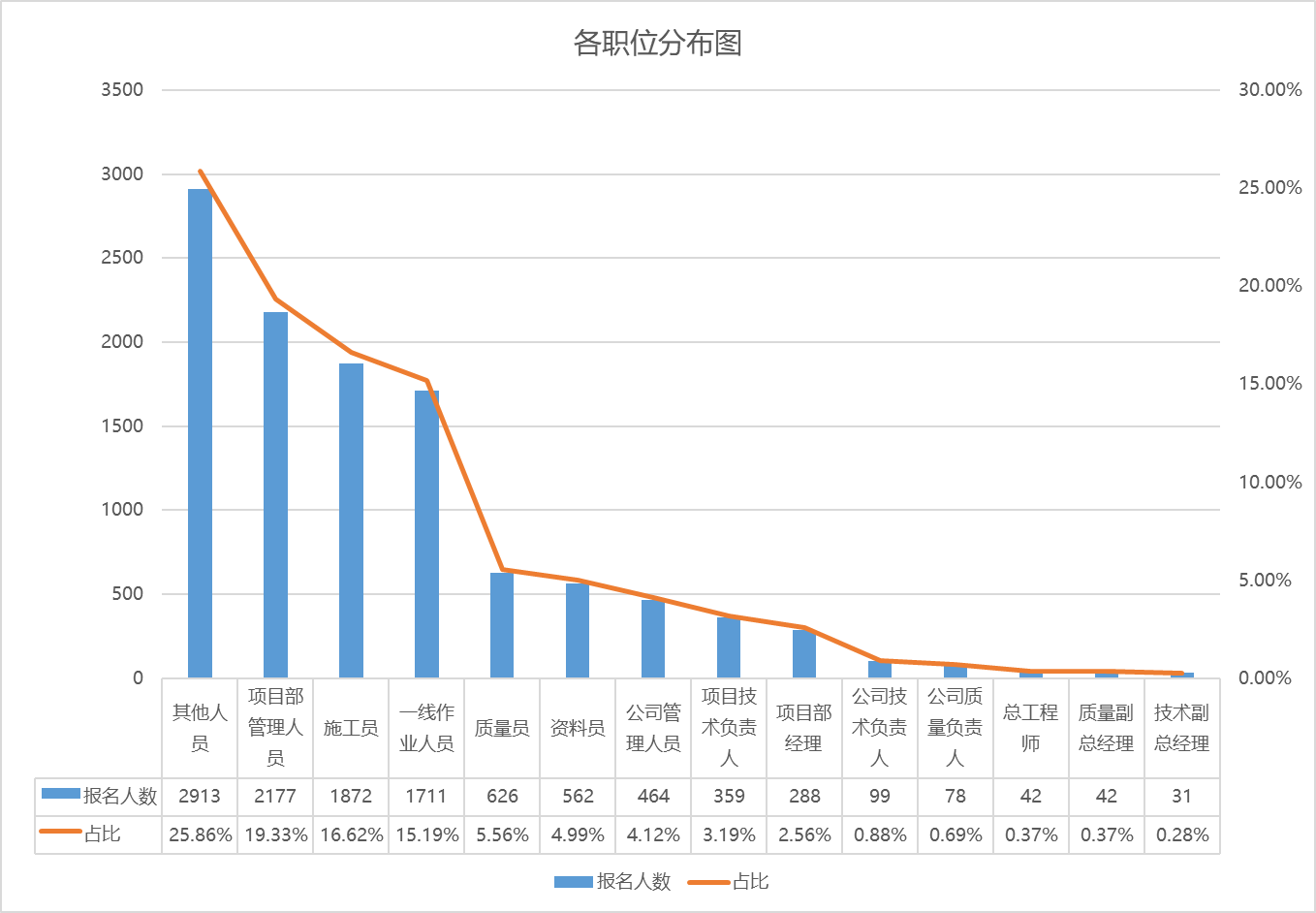 11264位报名参赛人员中,包括2177名项目管理人员,1872名施工员,1711名一线作业人员,626名质量员,562名资料员,464名公司管理人员,359名项目技术负责人,288名项目部经理,99名公司技术负责人,78名公司质量负责人,42名总工程师,42名质量副总经理,31名技术副总经理以及2913名其他人员。