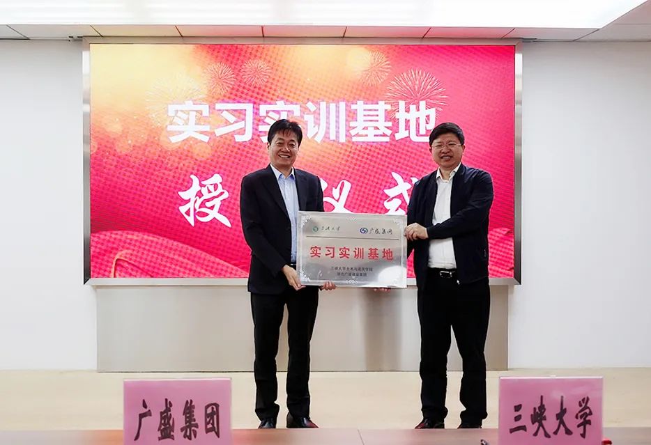 签约仪式上,三峡大学向广盛集团授牌“实习实训基地”和“研究生工作站”,聘任集团董事长匡玲为三峡大学兼职教授。