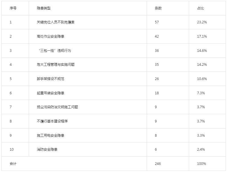 省厅成立6个暗访组,采取“四不两直”的方式对全省17个市州住建部门监管履职情况和部分在建房屋市政工程参建单位履行安全主体责任情况进行了暗访检查,发现了一些突出问题。一是管理部门工作责任压得不实。各地虽制定了安全生产治理行动巩固提升行动方案,开展了质量安全督导检查,但治理行动工作开展不全面,重点不突出。二是施工现场问题较多。共抽查在建房屋市政工程项目63个,下达执法建议书33份、限期改正通知书23份,责令停工整改工地9个,共涉及问题隐患246条(详见下表)。三是智慧工地建设推进不快。各地智慧工地建设还没有达到省厅要求,多个地区没有实质性进展,恩施、荆州、孝感、荆门、黄冈等地智慧工地建设覆盖率还不到2%。武汉、荆门、黄冈、恩施等地自有智慧工地平台开发、升级工作缓慢。各地接入省厅实名制系统数据覆盖率偏低。