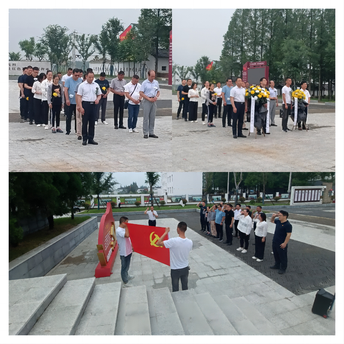 在潜江市渔洋镇拖船埠红色革命教育基地烈士纪念广场,同志们向革命烈士默哀、敬献花篮、缅怀英烈。在省质安协会党支部曹荣书记的领誓下,全体党员面向党旗,高举右手,重温入党誓词。在铮铮誓言中追忆入党初心,牢记党员使命,永葆党员本色,激励我们要始终牢记为什么入党,从哪里出发、为什么出发、走向哪里。随后,同志们参观了教育基地纪念馆。