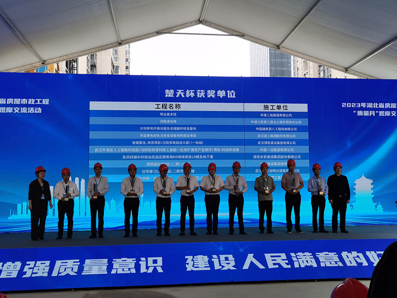 活动通报了2023年省级“质量月”观摩项目名单和2023年湖北省建设优质工程(楚天杯)创建示范活动项目名单,并为16个省级质量月观摩项目颁发了标牌,为10个省建设优质工程(楚天杯)的代表项目颁发了奖杯,通报了全省智慧工地推进情况。武汉主会场建设单位武汉首茂城置业有限公司代表交流了打造“好房子”管理经验,中建三局一公司、湖北联诺建设、上海宝冶集团、中建三局基建投武汉分公司等4家施工单位代表交流了建设“好房子”经验做法,武汉市城建局、宜昌市住建局、襄阳市住建局围绕建设“好房子”分别作了主题质量监管工作介绍。交流活动后,与会人员观摩了东湖金茂府杨春湖启动区CO1地块等4个项目打造“好房子”的现场做法。