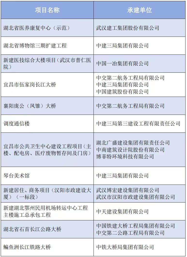 中国建设工程鲁班奖是我国建设工程质量的最高奖,1987年设立,每两年表彰一次(每年评审一次),获奖工程数额为240项左右。多年来,在省委、省政府大力实施“质量强省”战略的号召下,省住建厅出台了一系列支持企业创建精品工程的政策,鼓励企业争创优质工程。省质安协会紧紧把握政策走向,通过开展专家培训、过程指导、精品工程观摩、宣传推广等方式,积极引导企业打造精品工程;对拟创建精品工程的项目提前介入、重点培育、细节控制,全程组织专家进行指导,从实际需求出发,抓好前期策划、从严过程管控、确保一次成优,因地制宜营造我省企业创建精品工程的良好环境和氛围。我省建筑施工企业积极响应,在工程建设领域不断创造佳绩,今年再次续写鲁班奖创建的辉煌。此次我省获得鲁班奖的项目包括博物馆、美术馆、医院、桥梁等类别,都是造福百姓的民生工程;获奖单位既有在鄂央企,也有本地国企,还有省内民营企业;获奖工程属地包括了武汉、宜昌、襄阳、荆州、鄂州、黄冈等地,可谓百花齐放。