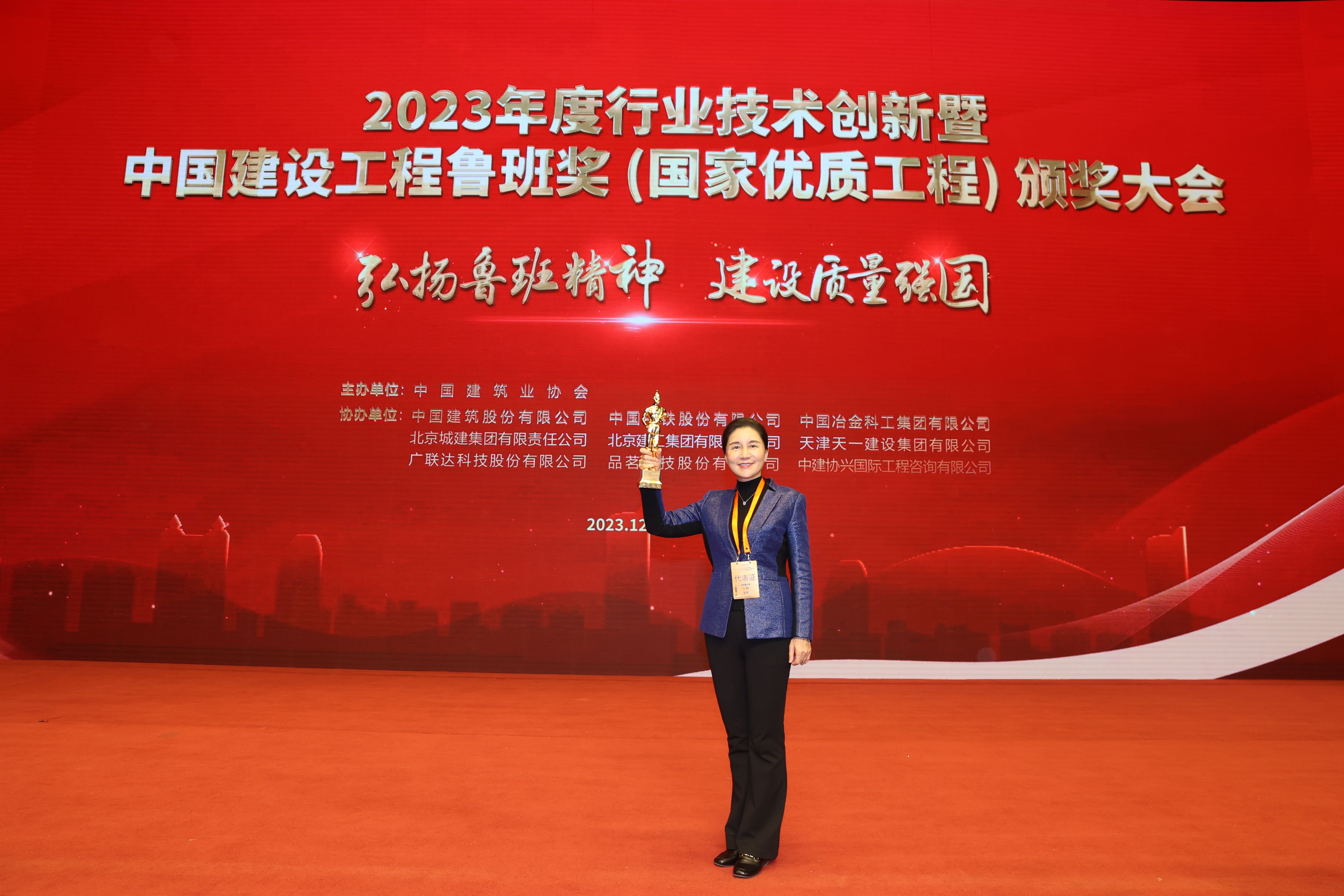 广盛集团董事长匡玲现场领奖,表示“再获鲁班奖、再圆‘鲁班梦’,极大提振了公司高质量发展的信心。我们将以此为新的起点,传承鲁班匠心,弘扬工匠精神,努力造出更多无愧于伟大时代的经典工程。”