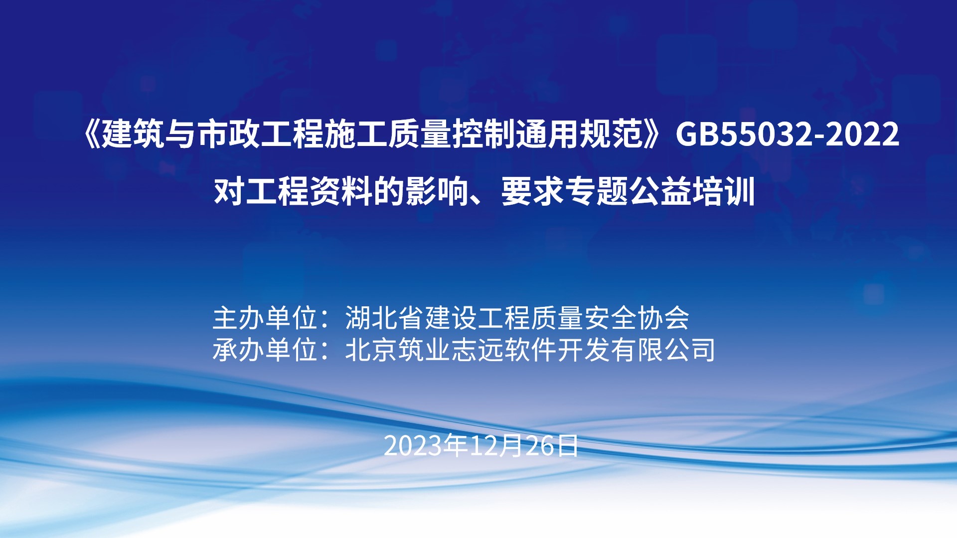 12 月 26 日下午,由省质安协会主办、北京筑业软件公司承办的《建筑与市政工程施工质量控制通用规范》(GB55032-2022)对工程资料的影响及要求专题公益培训通过线上网络直播的方式顺利举行。本次培训旨在帮助各单位有关人员更好的理解和学习最新国家标准主要内容,进一步加强和规范建筑与市政工程施工质量控制,切实提高施工质量控制水平,更好地推动建筑业高质量发展。培训吸引了2600多位来自各市(州)建设工程质量监督站、关联协会以及会员单位的从业人员参训。