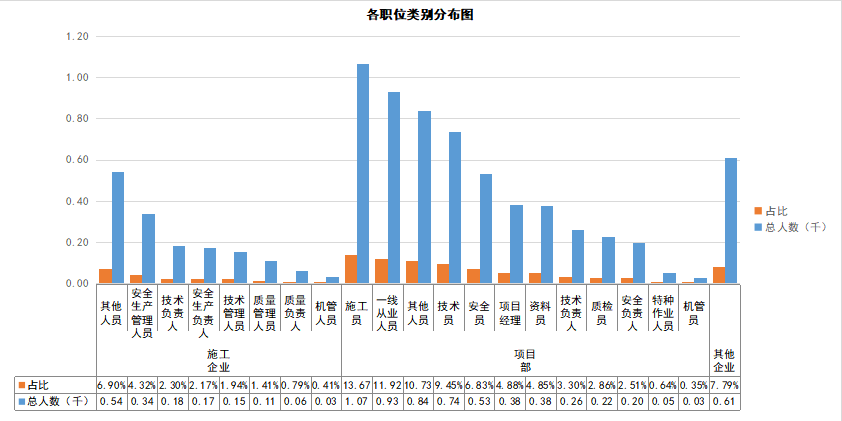 7822位报名参赛人员中,包括施工企业:安全生产管理人员338人、技术负责人180人、安全生产负责人170人、技术管理人员152人、质量管理人员110人、质量负责人62人、机管人员32人、其他人员540人;项目部:施工员1069人、一线从业人员932人、技术员739人、安全员534人、项目经理382人、资料员379人、技术负责人258人、质检员224人、安全负责人196人、特种作业人员50人、机管员27人、其他人员839人;其他企业609人。