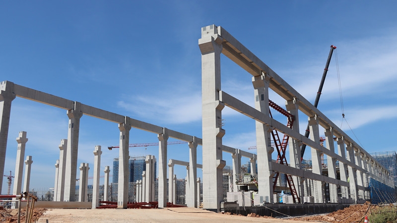 厂房的基础梁、框架柱连系梁、屋面梁、双T板天沟等所有结构构件均在工厂预制生产,现场同步装配。构件总量1752件,最重构件45吨,最高构件19米,双T板跨度最长达24米。