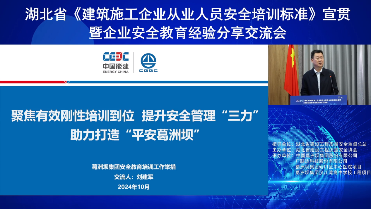 为进一步规范建筑施工企业安全培训工作,切实提升从业人员安全生产意识、安全操作技能和应急处置能力,交流建筑施工企业安全教育培训经验、做法。10月22日,由省建设工程质量安全监督总站指导,省建设工程质量安全协会主办,中国葛洲坝集团股份有限公司、中国葛洲坝集团建设工程有限公司、广联达科技股份有限公司、葛洲坝集团硚口区中心医院项目、葛洲坝集团汉江湾高中学校工程项目联合承办的湖北省《建筑施工企业从业人员安全培训标准》宣贯暨企业安全教育经验分享交流会在武汉召开。