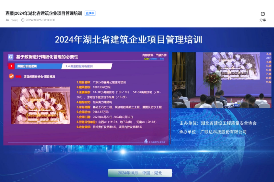 为加强湖北省工程建设项目的管理水平,提高建设工程项目管理理论与实践应用创新水平,10月25日上午,由湖北省建设工程质量安全协会主办,广联达科技股份有限公司承办的2024年湖北省建筑企业项目管理培训成功举办。各会员单位分管质量、技术的相关人员、项目管理人员、质量负责人、施工员等一线质量技术管理人员报名参加培训,直播观看学习人数达1476人次。