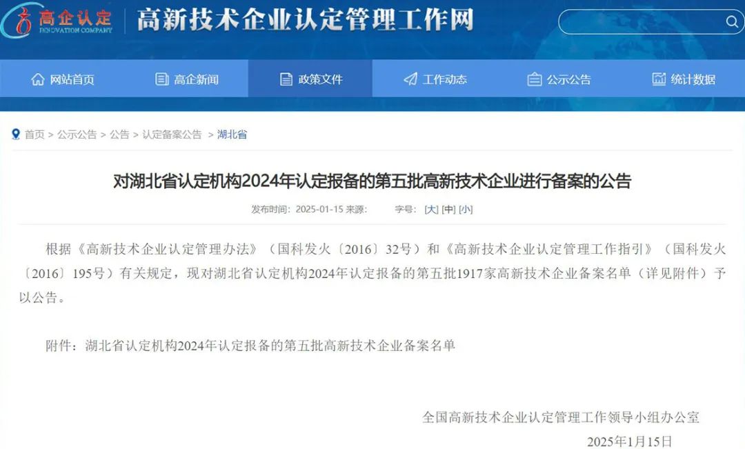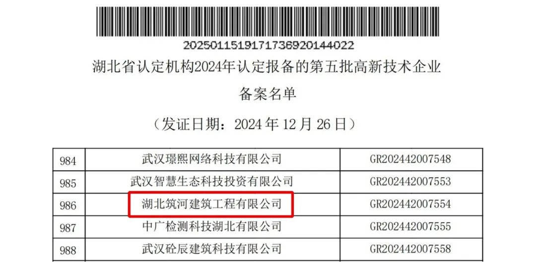 1月15日,全国高新技术企业认定管理工作领导小组办公室发布“对湖北省认定机构2024年认定报备的第五批高新技术企业进行备案的公告”,湖北筑河建筑工程有限公司通过国家高新技术企业认定。