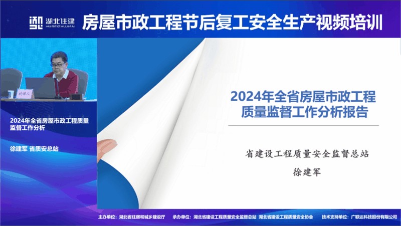 培训传达了湖北省贯彻落实第三轮中央生态环境保护督察反馈问题整改动员会议精神并对施工扬尘常态化管控提出从严管控要求,分析了2024年全省房屋市政工程质量安全管理工作形势,开展了《房屋市政工程生产安全重大事故隐患判定标准(2024版)》《危险性较大的分部分项工程专项施工方案严重缺陷清单(试行)》宣贯和节后复工监督检查要点培训,解读了《2025年全省建筑业高质量发展工作要点》《2025年全省房屋市政工程质量安全工作要点》。