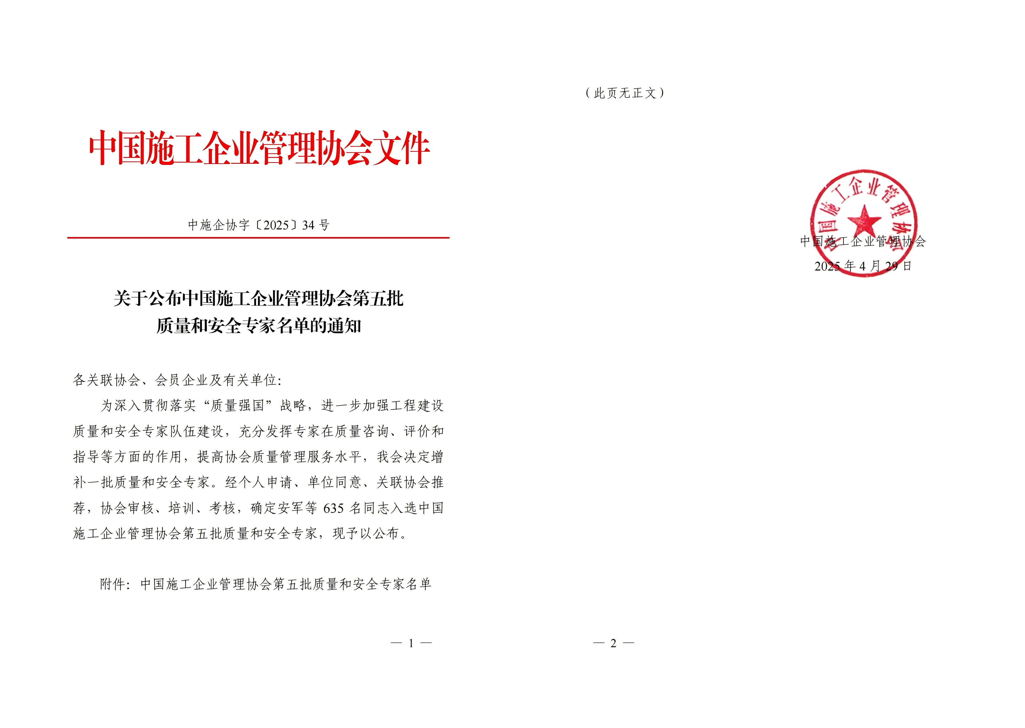 日前,中国施工企业管理协会发布了《关于公布中国施工企业管理协会第五批质量和安全专家名单的通知》(中施企协字〔2025〕34 号)。经我会积极组织推荐,共有44名在质量和安全管理领域具备深厚专业功底与丰富实践经验的专家脱颖而出,成功入选中施企协第五批质量和安全专家库。