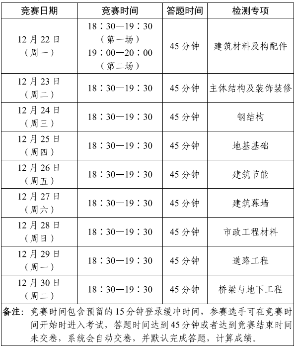 (二)报名参赛选手最多可申请考2个专项,每个专项凭身份证号在竞赛期间有1次竞赛答题机会。竞赛在12月22号至12月30号期间分为9天10个场次进行,其中:建筑材料及构配件同一天有两场考试,其他检测专项均只有一场考试,参赛选手可自行选择场次进行答题。具体开始时间如下: