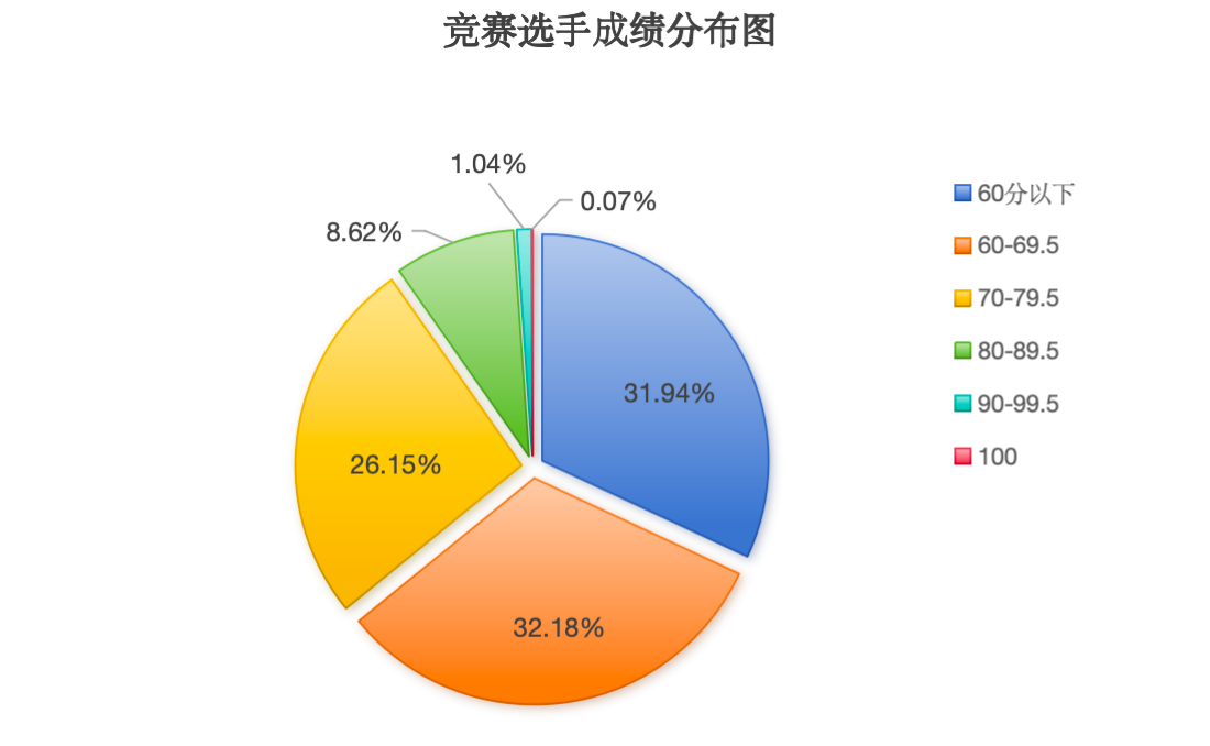本次竞赛中,100分的为5人次,占实际参赛人次比例的0.07%;90-99.5分的为79人次,占比1.04%;80-89.5分的为654人次,占比8.62%;70-79.5分的为1984人次,占比26.15%;60-69.5分的人为2441人次,占比32.18%;60分以下的为2423人次,占比31.94%。