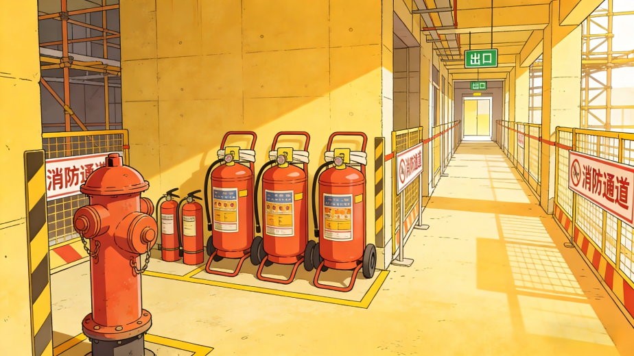 塔吊起重臂应调整至自由回转状态或采取可靠防风锚固,施工电梯、物料提升机须降至底层,切断主电源并上锁。小型机具应集中保管,氧气、乙炔等易燃易爆物品必须清退出场或存入专用库房。除必要的值班、监控用电外,必须切断施工区、办公区、生活区总电源。全面清理现场可燃杂物,配足消防器材,确保消防通道畅通。
