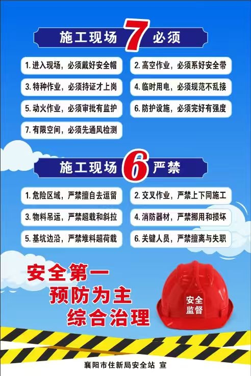 襄阳市针对节后人员易出现“假期综合征”,编制通俗易懂的施工现场安全作业提示口诀“7必须、6严禁”,帮助从业人员快速从节日模式切换至生产模式,严防高坠、物体打击等事故发生,以“开门安”护航两会安全。