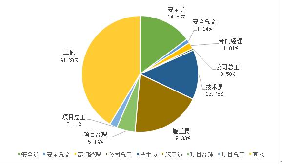 本次竞赛报名人数中,20-30岁人数达3491人,20岁以下54人,30-40岁3876人,40-50岁人数达2270,50-60岁人数1038人,60岁以上还有49人,年龄比例详见图3。另外,在所有报名人数中,安全员、施工员和技术员占比较高,项目总工和公司总工分别有227人和54人参加,详见图4。