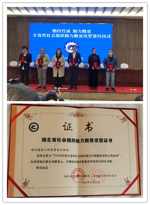 湖北省社会组织管理局和湖北省社会组织总会向我会颁发湖北省社会组织助力脱贫攻坚证书,肯定我会参与“2020年度全省性社会组织助力竹溪脱贫攻坚示范活动”,向贫困地区群众奉献爱心,为湖北决战决胜脱贫攻坚作出了切实贡献。