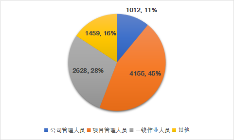 9254位报名参赛人员中,包括1012位公司管理人员,4155位项目管理人员,2628位一线作业人员,以及1459位其他人员,详见图2。