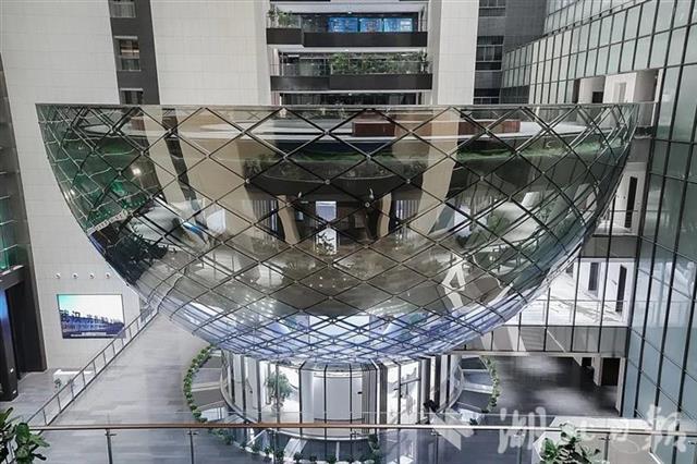 针对结构特点,项目团队采用BIM设计、三维建模、中庭集成建造等技术。施工人员将幕墙玻璃编号下单,分片组装后提升翻转就位,保证了幕墙的安装精度和结构一次成优率。