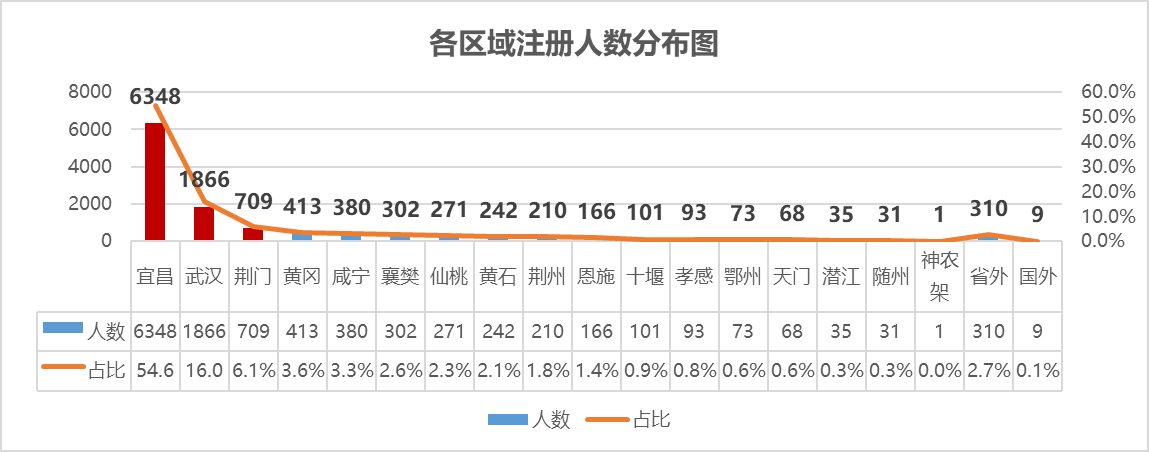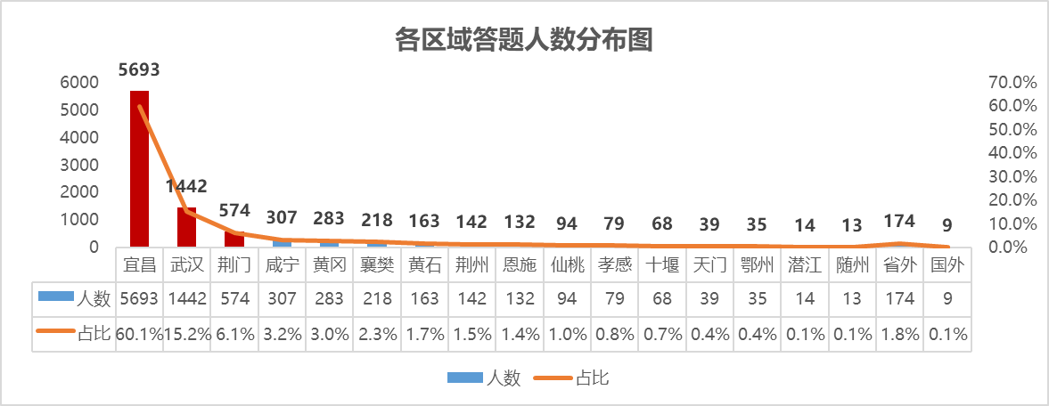 本次竞赛平台注册人数达11629名,实际考试人数9530人,参加考试率为81.9%,其中宜昌5693人,武汉1442人,荆门574人,咸宁307人,黄冈283人,襄阳218人,黄石163人,荆州142人,恩施132人,仙桃94人,孝感79人,十堰68人,天门39人,鄂州35人,潜江14人,随州13人;省外项目174人,国外项目9人。详见图1和图2。