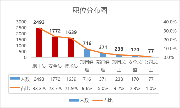 本次竞赛平台注册人数中,20-30岁占比29.2%,30-40岁占比38.2%,详见图3;注册人员以施工员居多,占比33.3%,技术人员、安全人员占比也较多,详见图4。