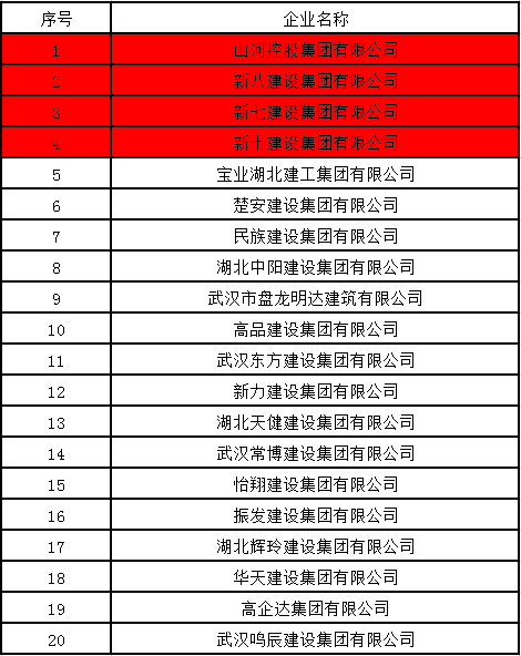 8月26日,武汉发布“2021武汉民营企业100强”和“2021武汉民营制造业企业50强”排序榜,排序榜由相关市直部门共同组织,在尊重企业自主申报原则的基础上,以2020年企业营业收入总额为依据,由市工商联完成。我会共有20家会员单位入选“2021武汉民营企业100强”榜单,其中:山河控股集团有限公司、新八建设集团有限公司、新七建设集团有限公司、新十建设集团有限公司4家单位位列榜单前10位。