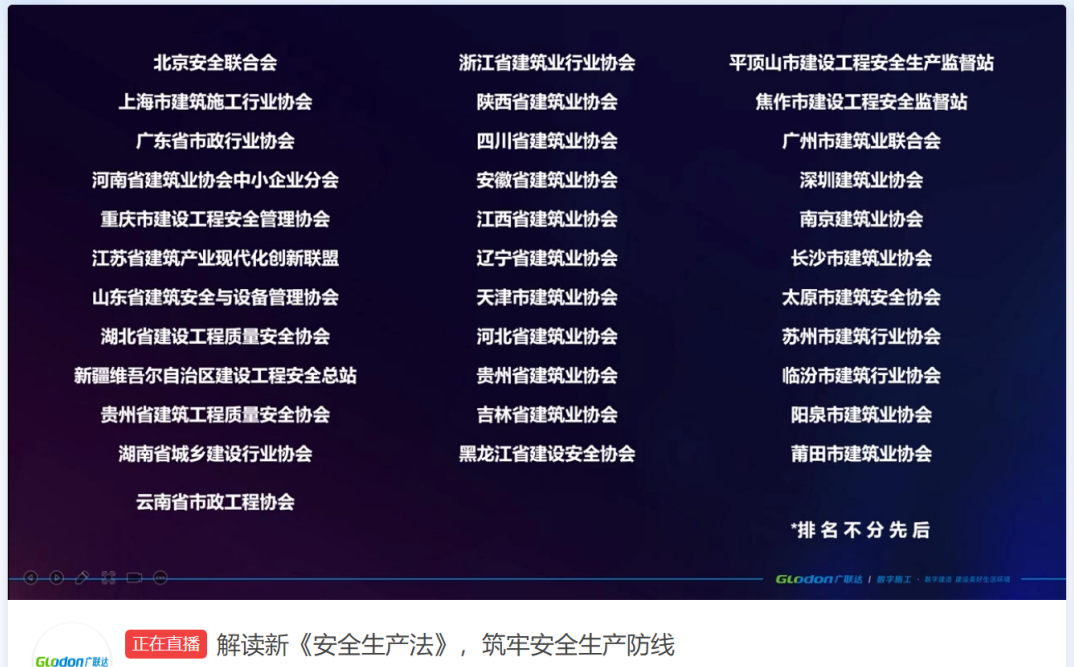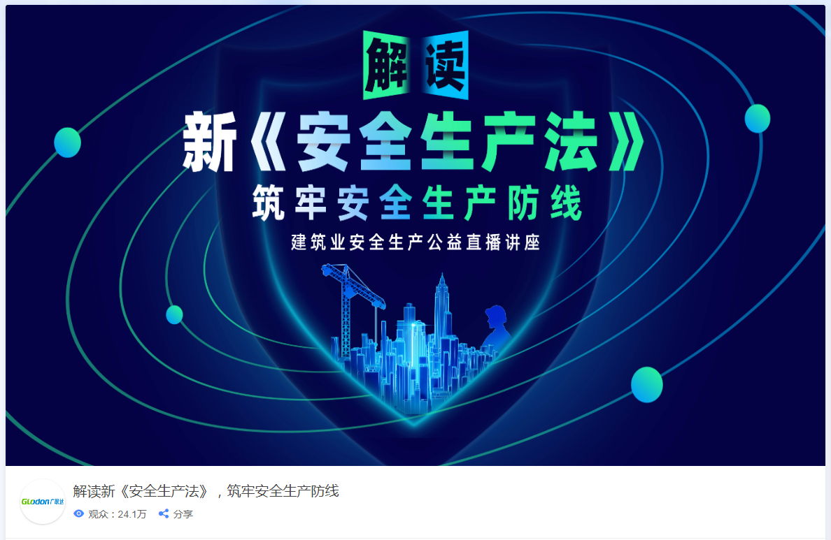 为深入贯彻党中央、国务院关于安全生产的决策部署,推进安全生产各项重点工作,全面防范安全生产风险,坚决遏制各类生产安全事故,迎接第十三届全国人民代表大会常务委员会第二十九次会议通过的《中华人民共和国安全生产法》在9月1日顺利实施。省建设工程质量安全协会联合广联达科技股份有限公司于8月31日下午举办了一期“解读新《安全生产法》,筑牢安全生产防线”建筑业安全生产公益线上讲座,讲座累计在线人次达24.1万余人。